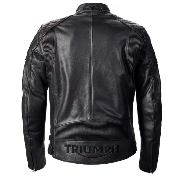 Cuir pleine fleur. Zones flexibles extensibles pour un meilleur confort. Taille réglable. Aération sous les manches. Fermeture zippée. Zips aux poignets. Deux poches réchauffe main zippées. Panneaux matelassés sur les épaules et le haut du bras. Col officier, fermeture à bouton pression. Protections D3O amovibles au niveau des épaules et des coudes, certifiés CE selon la norme EN 1621-1:2012. Protection dorsale amovible D3O BP3, certifiée CE selon la norme EN 1621-2:2014. Zip de connexion aux jeans de la gamme. Graphisme Triumph dans le bas du dos et sur la manche gauche. Graphisme Union Jack Triumph sur la manche gauche