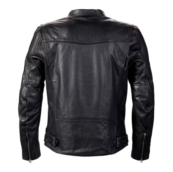 Un blouson noir en cuir avec des protections amovibles certifiées CE, trois poches zippées pratiques, un réglage au niveau de la taille et un design pensé pour l’action contribuant largement au confort de conduite.