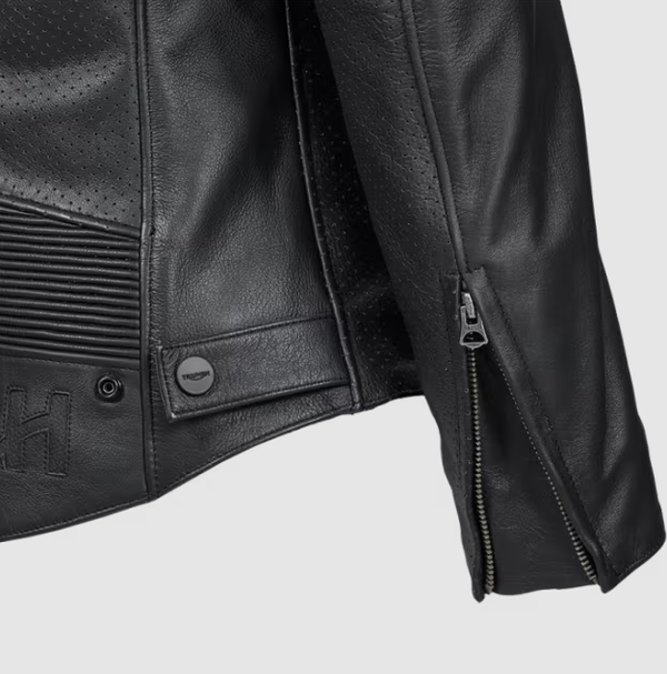 Un blouson de moto classique à col montant, coupe pensée pour les femmes, fabriqué en cuir perforé premium. Matelassage aux épaules, logo appliqué inversé en cuir sur l’ourlet inférieur et rayures inspirées de la compétition sur chaque manche.