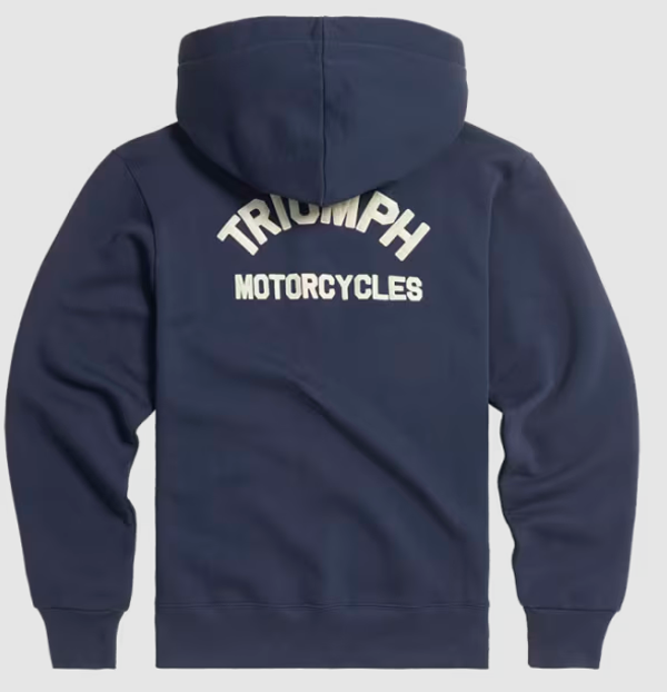 Un sweat à capuche en coton épais en blanc cassé avec l’inscription Triumph Motorcycles brodée en arc de cercle en petit format sur la poitrine gauche et en grand format dans le dos, un zip avant intégral, deux poches kangourou et une capuche à cordons.
